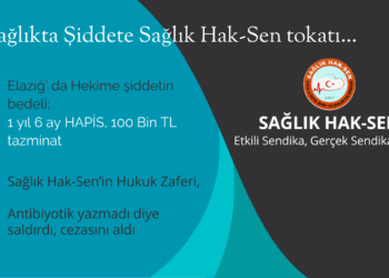 Haberin DevamıDetailsElazığ’ da Hekime şiddetin bedeli; 1 yıl 6 ay HAPİS, 100 Bin TL tazminat Sağlık Hak-Sen’in Hukuk Zaferi, Antibiyotik yazmadı diye saldırdı, cezasını aldı