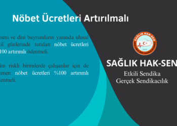 Nöbet Ücretleri Artırılmalı Resmi ve dini bayramların yanında ulusal tatil günlerinde tutulan nöbet ücretleri %100 artırımlı ödenmeli. Tüm riskli birimlerde çalışanlar için de ödenen nöbet ücretleri %100 artırımlı ödenmeli.